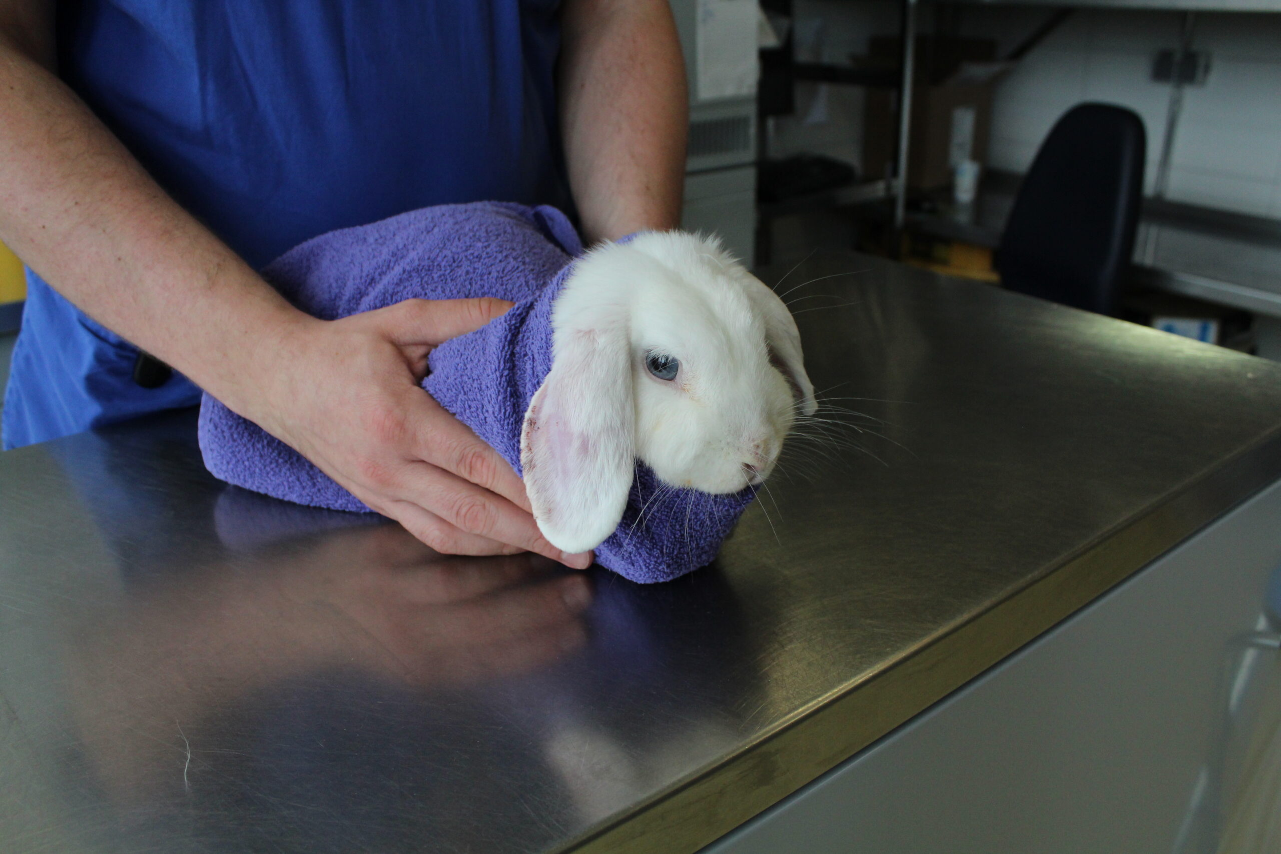 Für die richtige Korrektur der Schneidezähne muss das Tier sicher auf dem Behandlungstisch fixiert werden. Dafür sollte man den Patienten auf eine rutschfeste Unterlage setzen. Ein Handtuch kann genutzt werden, um das Tier wie einen Wrap einzuwickeln (Abb. 1). Damit verhindert man, dass sich das Tier übermäßig bewegt oder mit seinen Vorderpfoten versuchen kann, nach den Instrumenten zu treten. Nun wird der Patient an der Tischkante fixiert.