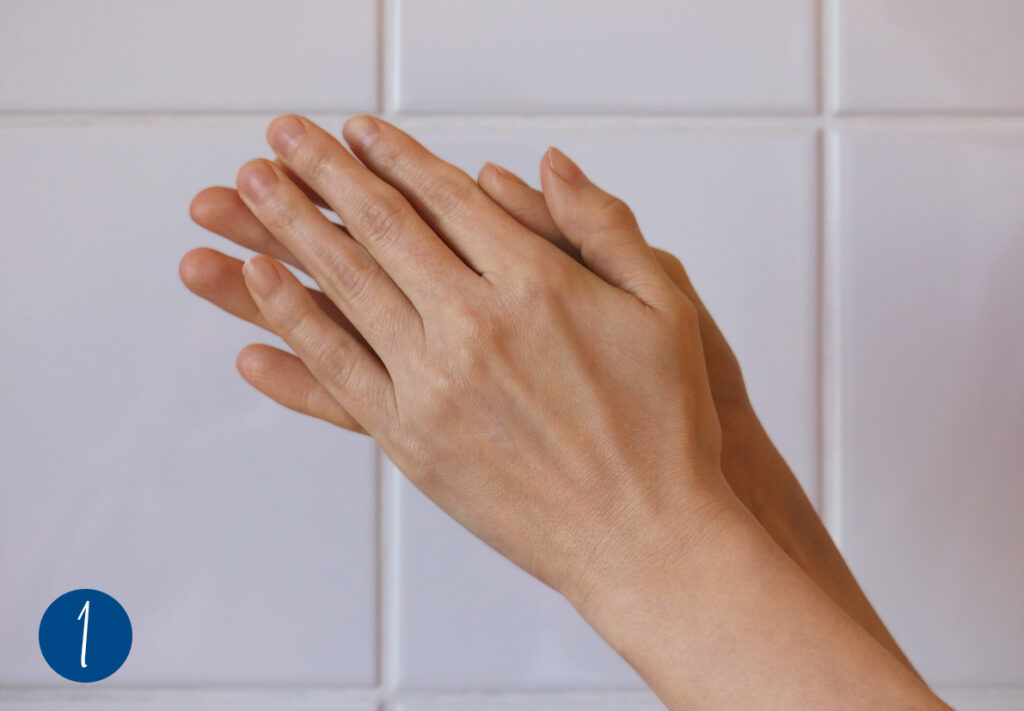 6. Für die chirurgische Händedesinfektion reibst Du die Lösung nun kräftig in die Hände bis zu den Handgelenken. Verteile sie dazu zunächst auf den Handflächen (Abb. 1).