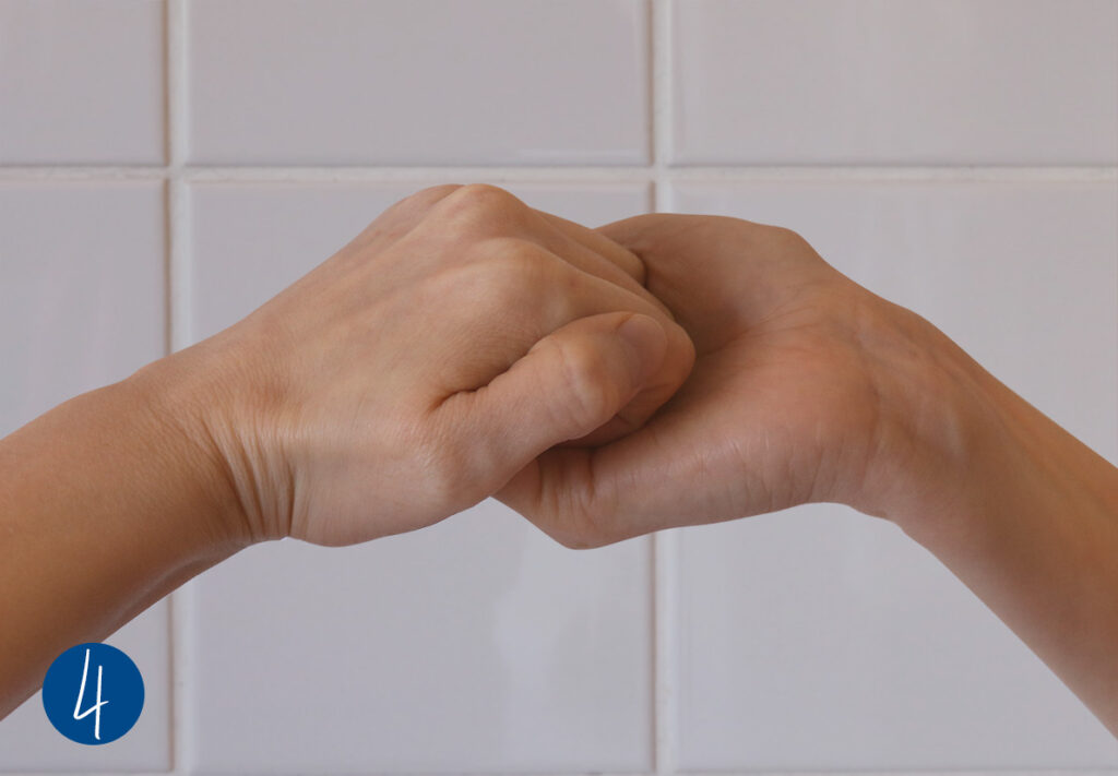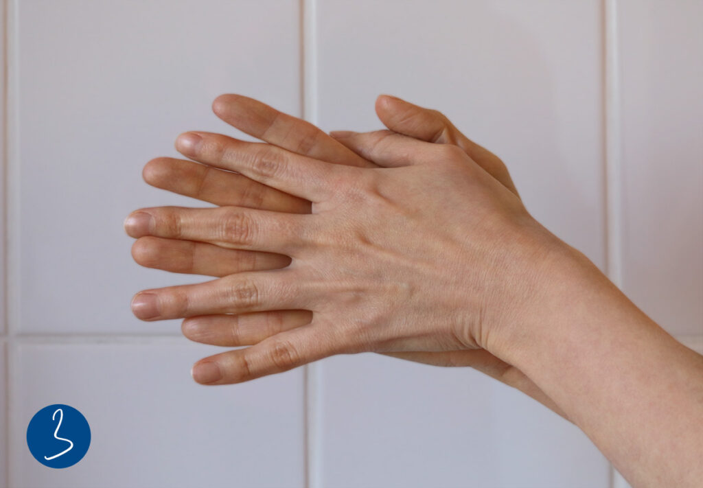 9. Die Außenseite der Finger desinfizierst Du, indem Du sie in der Handfläche der anderen Hand mit verschränkten Fingern reibst (Abb. 4).