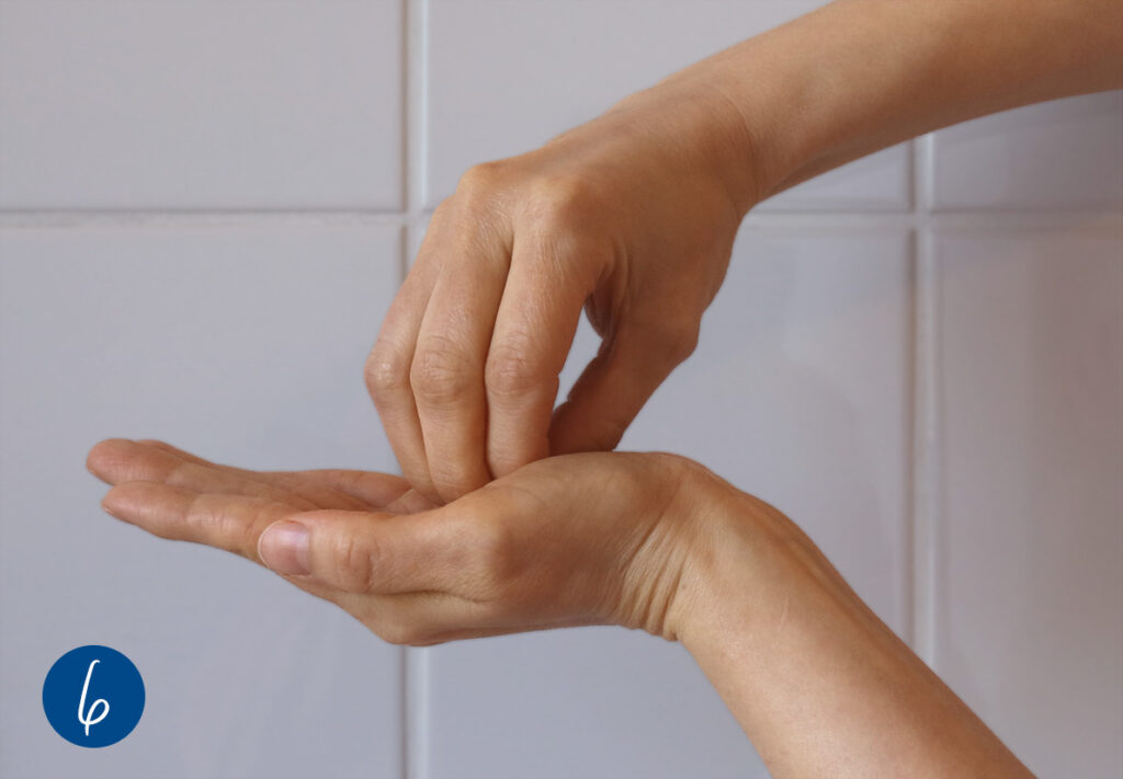 10. Den Daumen einer jeden Hand desinfizierst Du durch kreisende Bewegungen in der geschlossenen Handfläche der gegenüberliegenden Hand (Abb. 5).